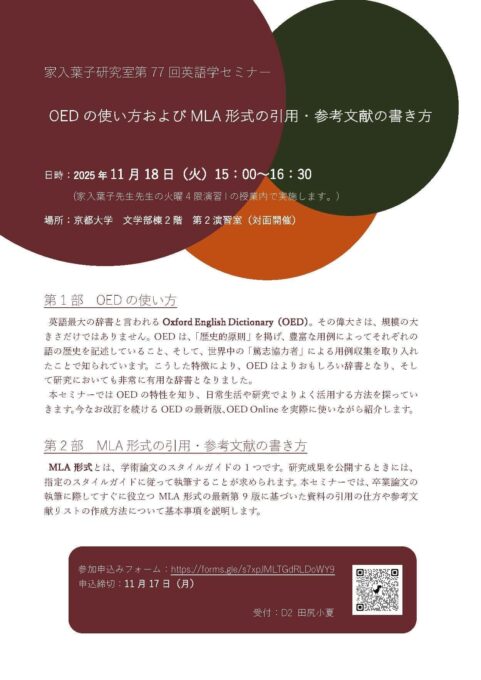 • 2025年10月28日研究室情報授業家入葉子研究室第77回英語学セミナー