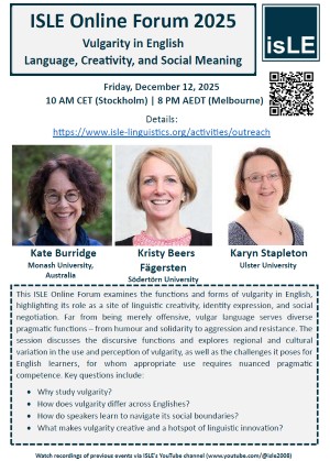 The ISLE (International Society for the Linguistics of English) Summer School 2026 will be held at Uppsala University (Uppsala, Sweden) from 7 to 13 July 2026. In addition to the following six courses, four plenary lectures are scheduled.